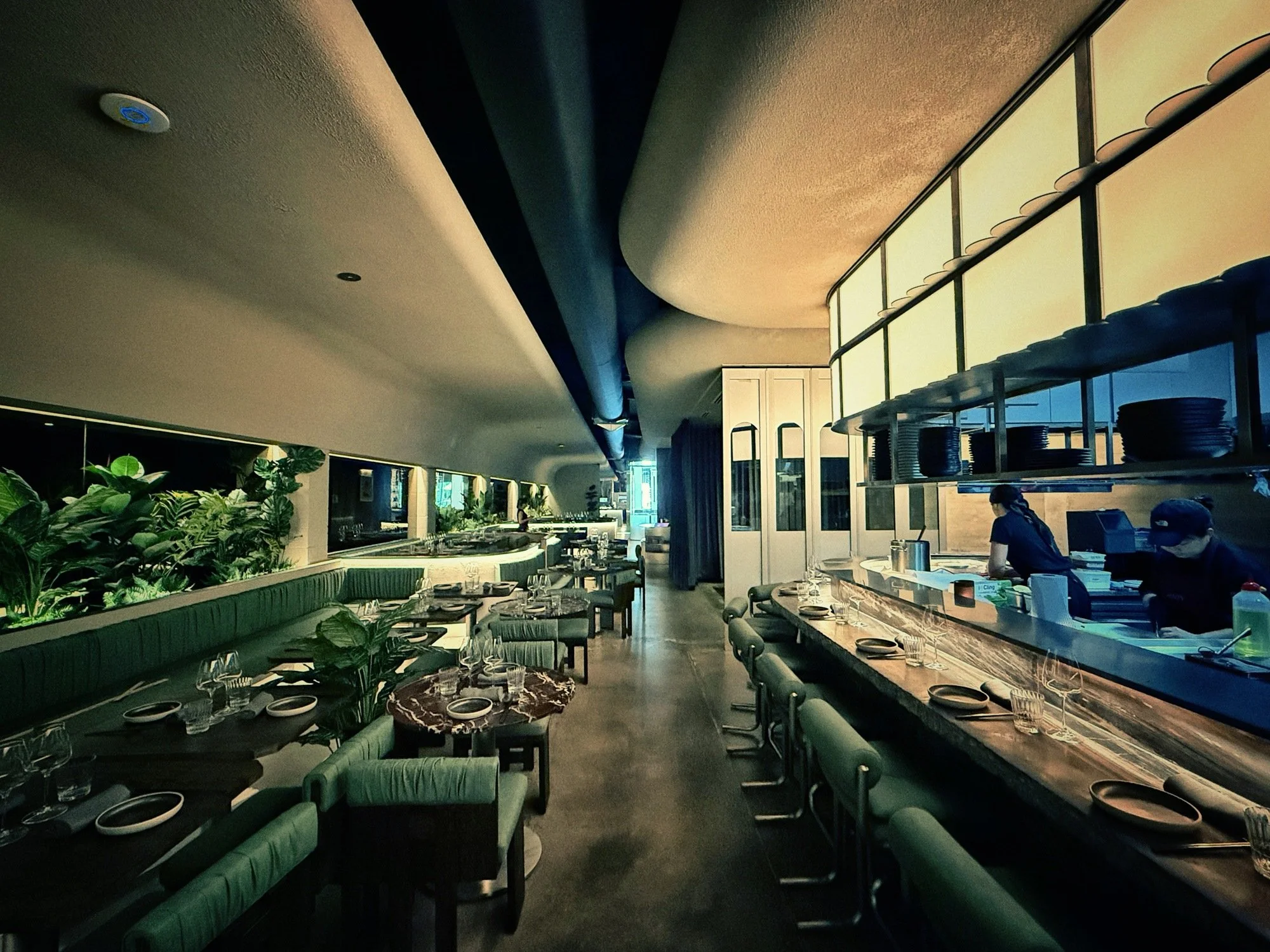 Through the grand mirrored sliding door, a 100 seat dining room reveals itself, thoughtfully divided into distinct zones: intimate pockets for conversation, a semi-private space for up to 24 guests, and a swanky marble counter anchoring the open kitchen.